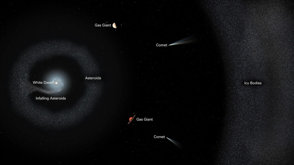 About 5 billion years later, when our sun turns into a white dwarf, if any extraterrestrial civilization observes it, it will probably see something like this. In the process of expansion, the inner objects of the solar system may evaporate, but the asteroid belt between Mars and Jupiter may have survived, which could have been dispersed by a destabilized Jupiter and rained down on a dead star.
