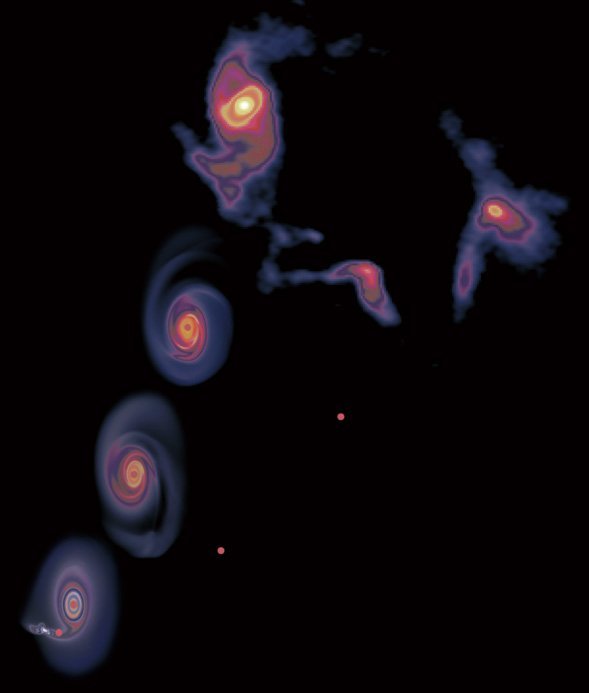 The picture below first shows the first stage of interaction with light, followed by the result obtained after 4000 and 8000 years (emergence of spiral beams). Finally we see an image of a shape formed at an interval of 12,000 years taken by a telescope.