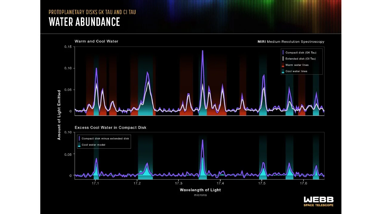 A two-tiered spectral graph. The top graph compares the spectral data for warm and cool water in the compact GK Tau disk with the extended CI Tau disk. The bottom graph shows the excess cool water data in the compact GK Tau disk minus the cool water data in the extended CI Tau disk. Credit: NASA, ESA, CSA, Joseph Olmsted (STScI)